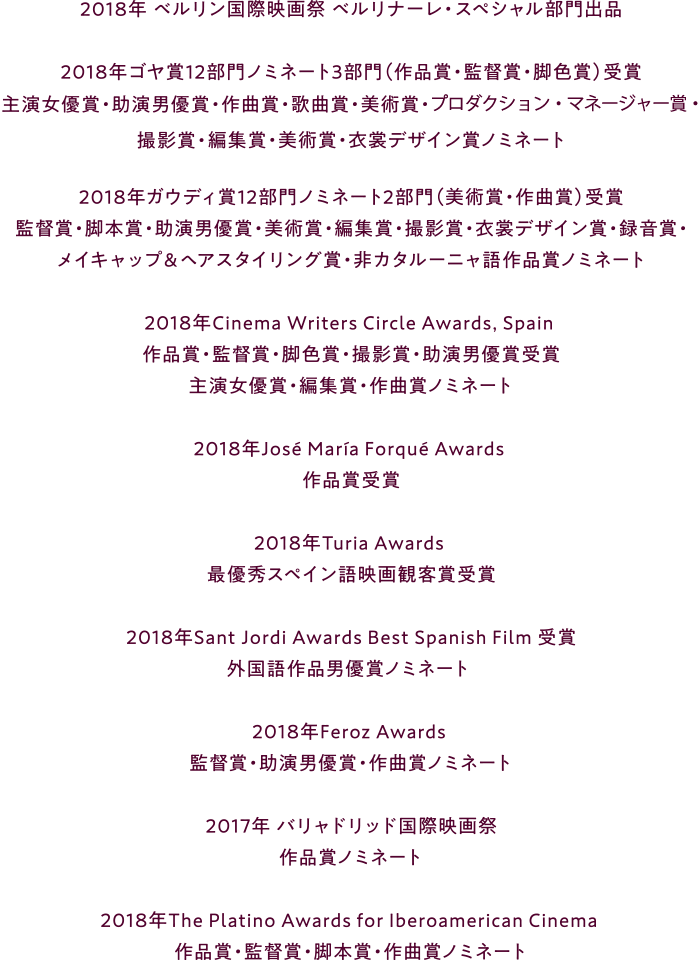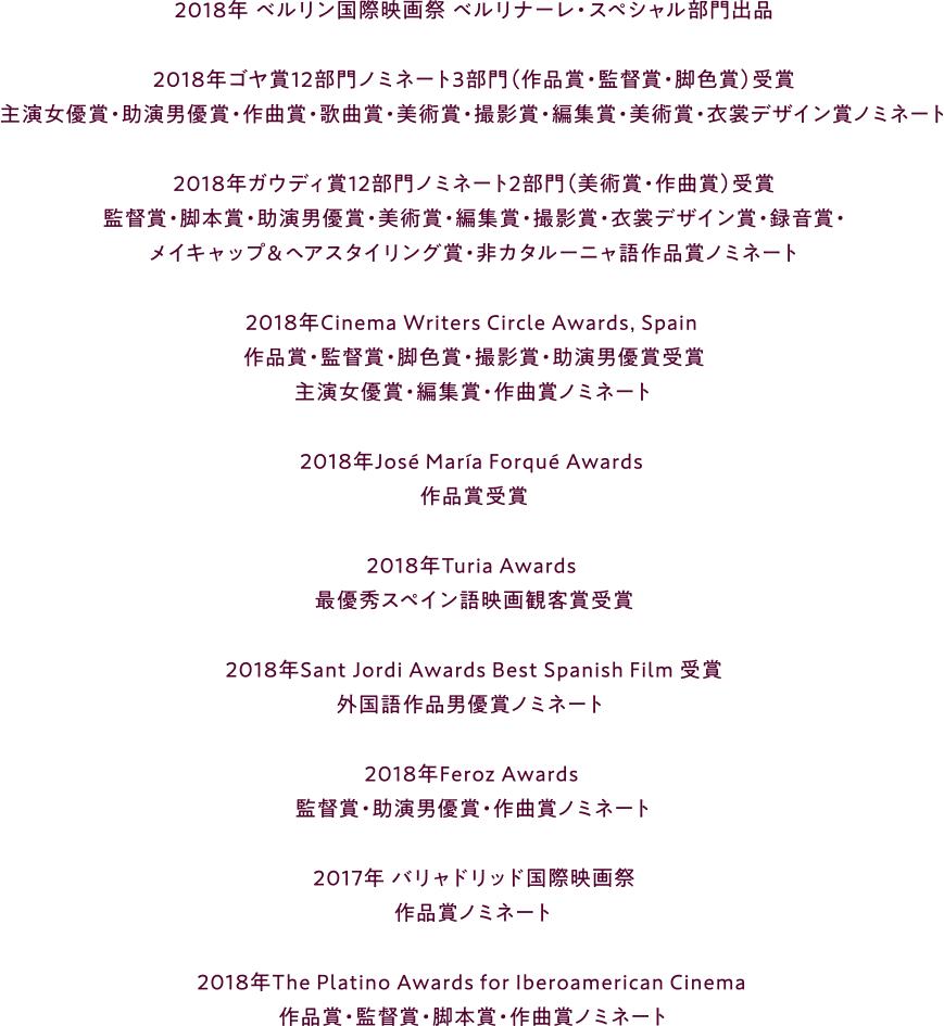 主なフィルモグラフィーに、第84回アカデミー外国語映画賞のスペイン代表に選ばれた他、2011年ゴヤ賞では14部門のノミネートを受け、作品賞をはじめとする9部門で受賞(彼女自身も衣裳デザイン賞受賞)した『ブラック・ブレッド』 (10) 、2015年ゴヤ賞で衣裳デザイン賞を受賞した『Stella cadente(原題)』 (14) 、2018年ガウディ賞衣裳デザイン賞を受賞した『ひとときの栄光』(17).など。本作で、2018年ガウディ賞とゴヤ賞の衣裳デザイン賞にノミネートされた。