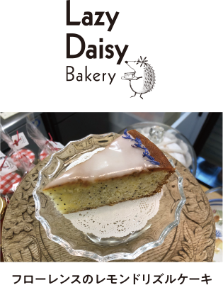 イギリス菓子店レイジーデイジーベーカリーでは、映画の主人公フローレンスをイメージした期間限定ケーキが登場!(一日限定数)ブルーポピーシードを合わせた生地にレモンシロップをたっぷりしみこませたイギリス菓子をぜひお試しください。