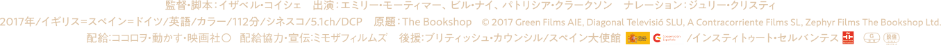 ヒロインのフローレンスを演じるのは、最新作『メリー・ポピンズ リターンズ』(19)のエミリー・モーティマー。ウディ・アレンの『マッチポイント』(05)などで強い印象を残してきた彼女が、意志の強さと柔らかな雰囲気、はにかんだ笑顔をバランスよく配合し、誰もが共感し応援せずにいられないヒロイン像を魅力的に演じた。変わり者の老紳士で心強い協力者、ブランディッシュ氏を演じるのは、『ラブ・アクチュアリー』(03)や、『パイレーツ・オブ・カリビアン』のデイヴィ・ジョーンズ役で世界中にファンを持つイギリス紳士の代名詞ビル・ナイ。ガマート夫人を演じるのは、コイシェ監督の『しあわせへのまわり道』(14)に主演したパトリシア・クラークソン。また、本作のナレーションを務めた名女優ジュリー・クリスティはフランソワ・トリュフォー監督の『華氏451』(67)の主演女優であり、コイシェは、この声のキャスティングはトリュフォー作品へのオマージュと語っている。